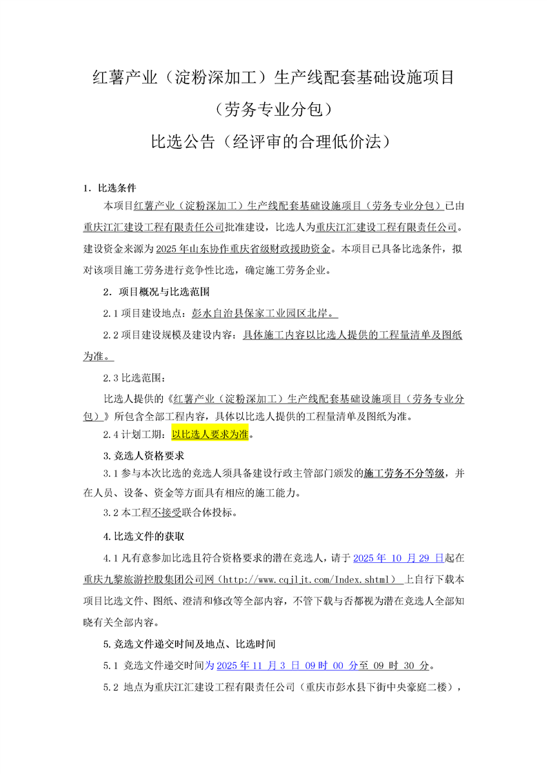 紅薯產(chǎn)業(yè)(淀粉深加工)生產(chǎn)線(xiàn)配套基礎(chǔ)設(shè)施項(xiàng)目 (勞務(wù)專(zhuān)業(yè)分包) 比選公告(經(jīng)評(píng)審的合理低價(jià)法)