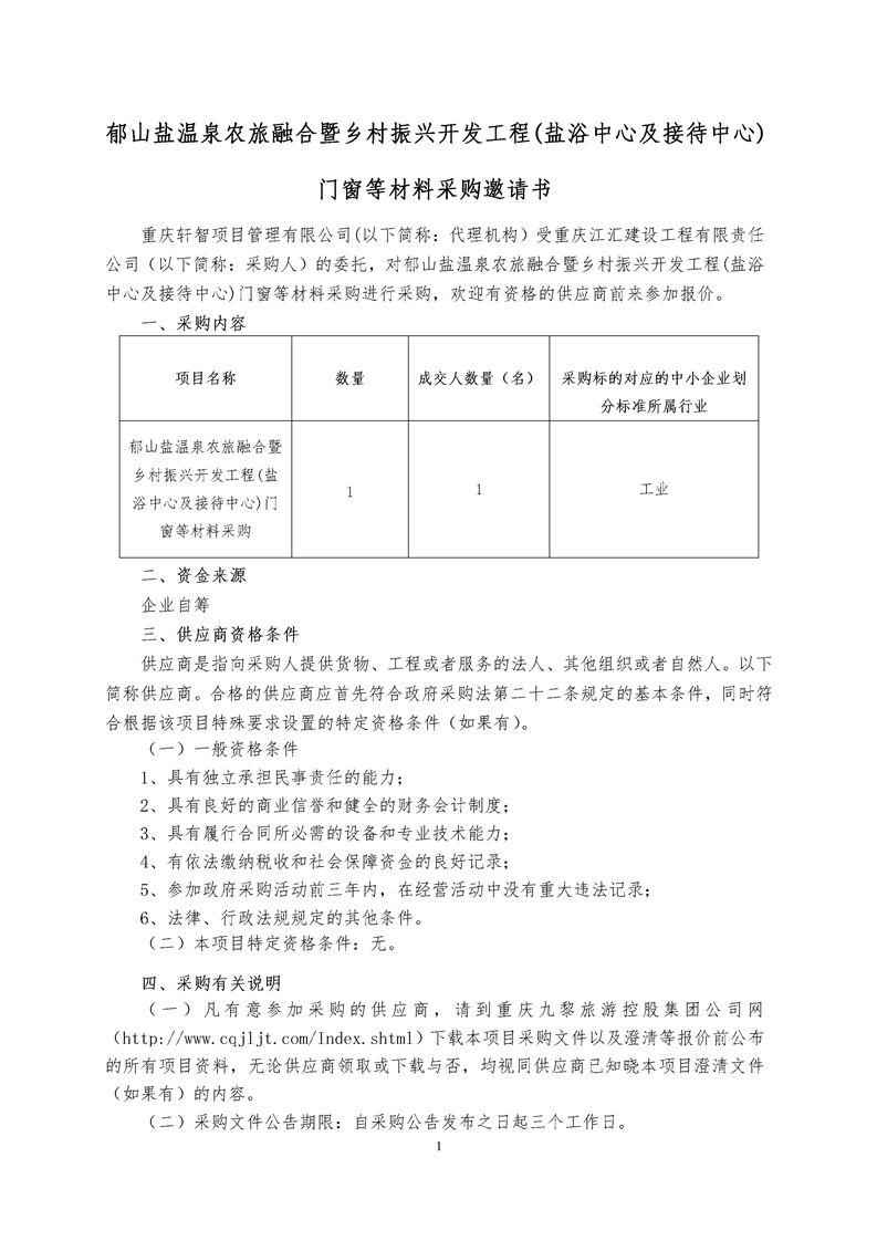 郁山鹽溫泉農(nóng)旅融合暨鄉(xiāng)村振興開發(fā)工程(鹽浴中心及接待中心)門窗等材料采購(gòu)邀請(qǐng)書