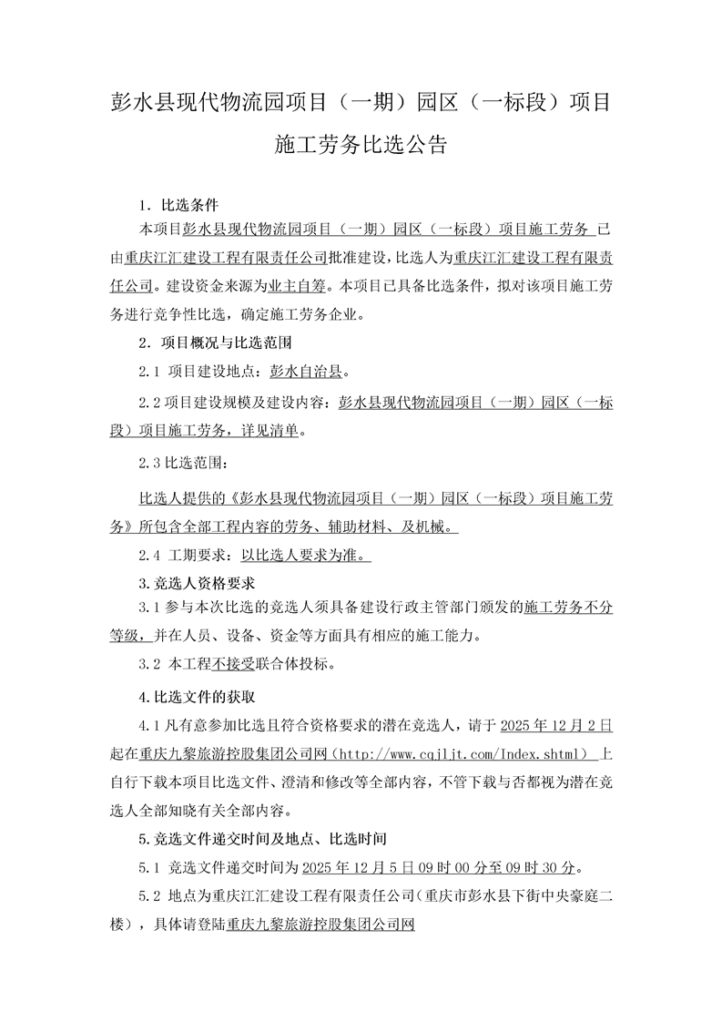 彭水縣現(xiàn)代物流園項(xiàng)目(一期)園區(qū)(一標(biāo)段)項(xiàng)目施工勞務(wù)比選公告