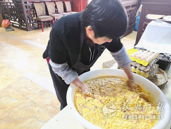 中國彭水網(wǎng)(全媒體記者 張茂玉 楊 靜 文/圖)三香,又叫包圓或卷子,是將五花肉、紅薯淀粉、土雞蛋等食材按一定比例蒸制而成。三香口感香嫩潤滑、美味可口,營養(yǎng)搭配合適,又因其易于保存、方便攜帶,成為了彭水人外出求學(xué)或打工時(shí)必帶的家鄉(xiāng)美食。