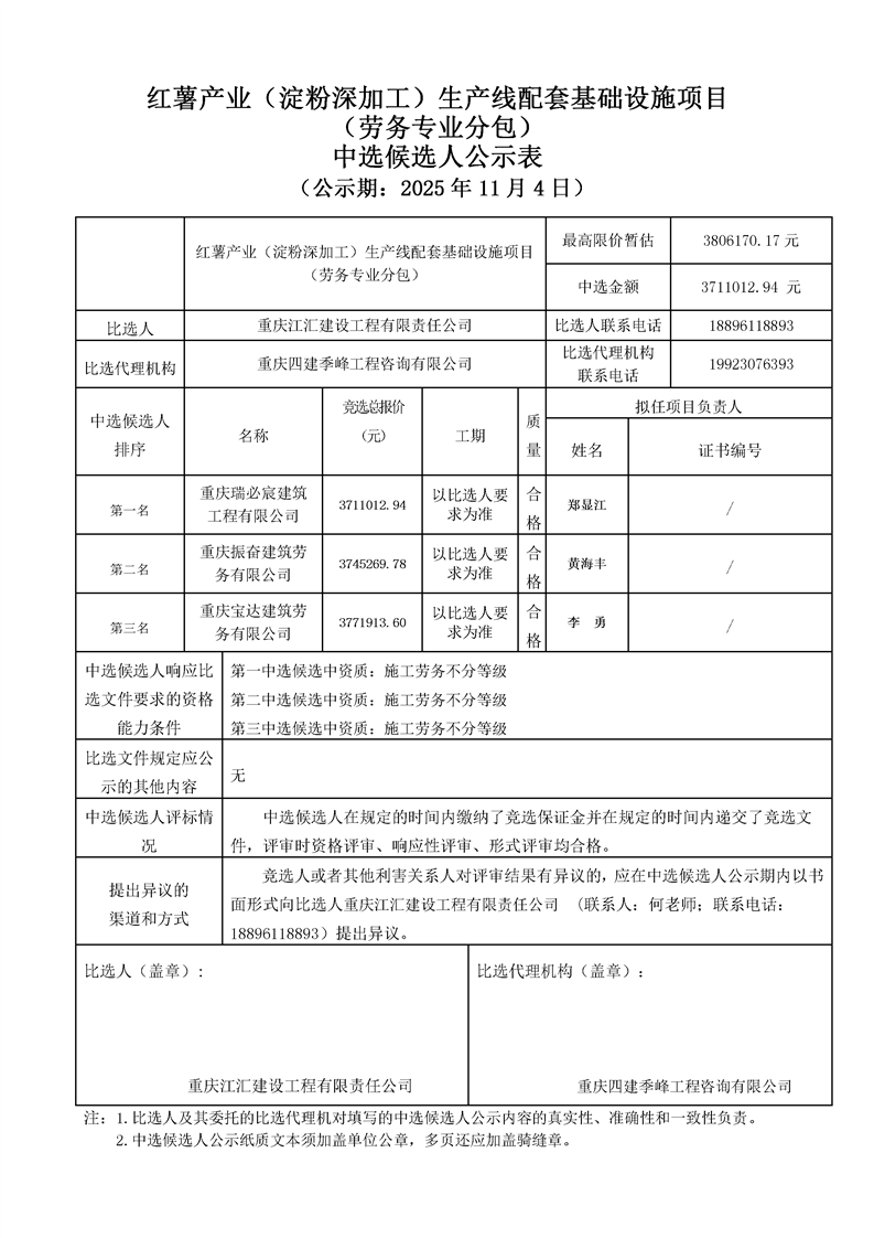紅薯產(chǎn)業(yè)(淀粉深加工)生產(chǎn)線配套基礎(chǔ)設(shè)施項(xiàng)目(勞務(wù)專業(yè)分包)中選候選人公示表