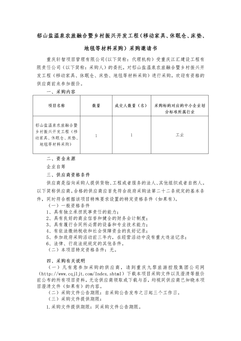 郁山鹽溫泉農(nóng)旅融合暨鄉(xiāng)村振興開發(fā)工程(移動(dòng)家具、休眠倉(cāng)、床墊、地毯等材料采購(gòu))采購(gòu)邀請(qǐng)書