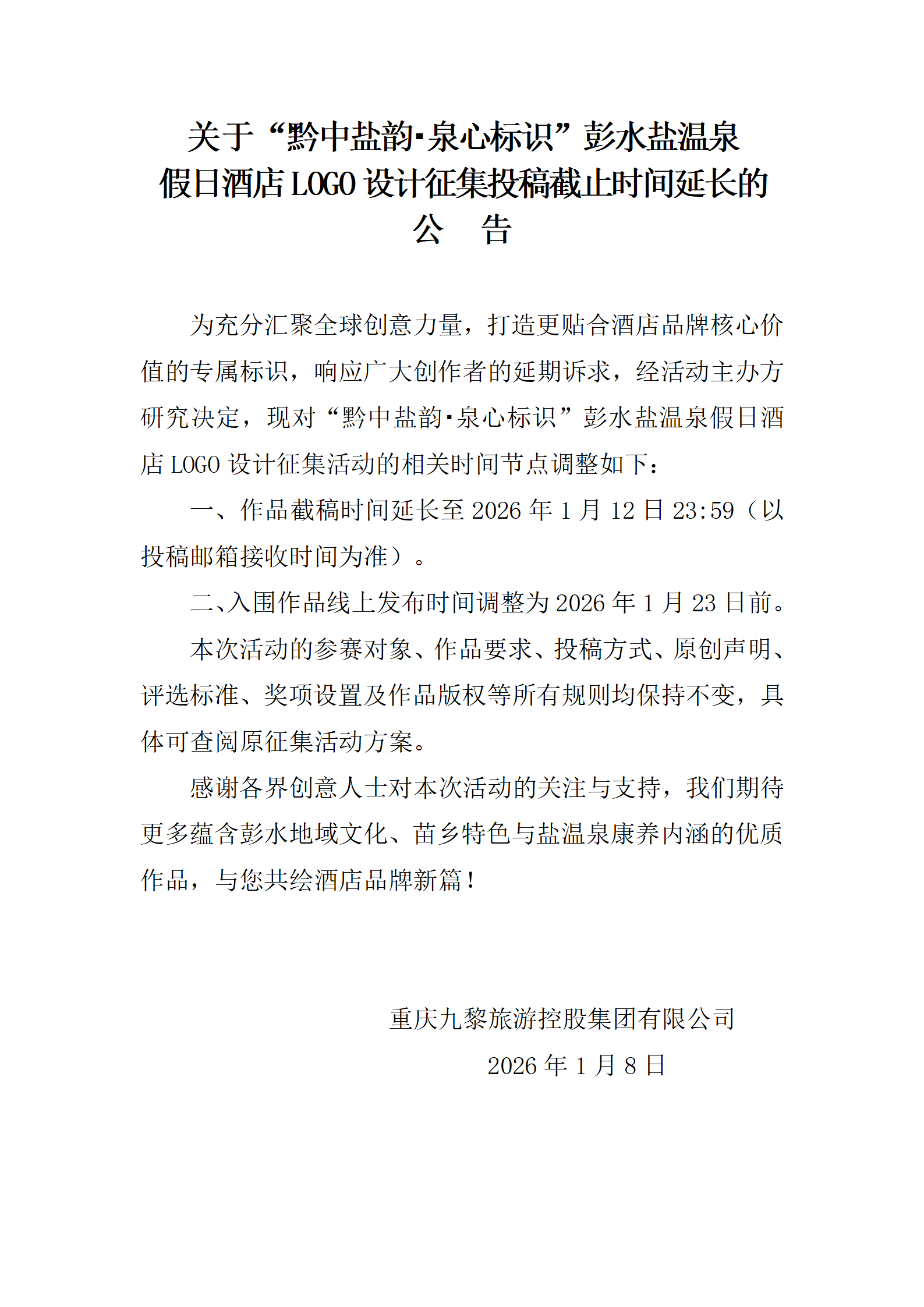關于“黔中鹽韻・泉心標識”彭水鹽溫泉假日酒店LOGO設計征集投稿截止時間延長的公告
