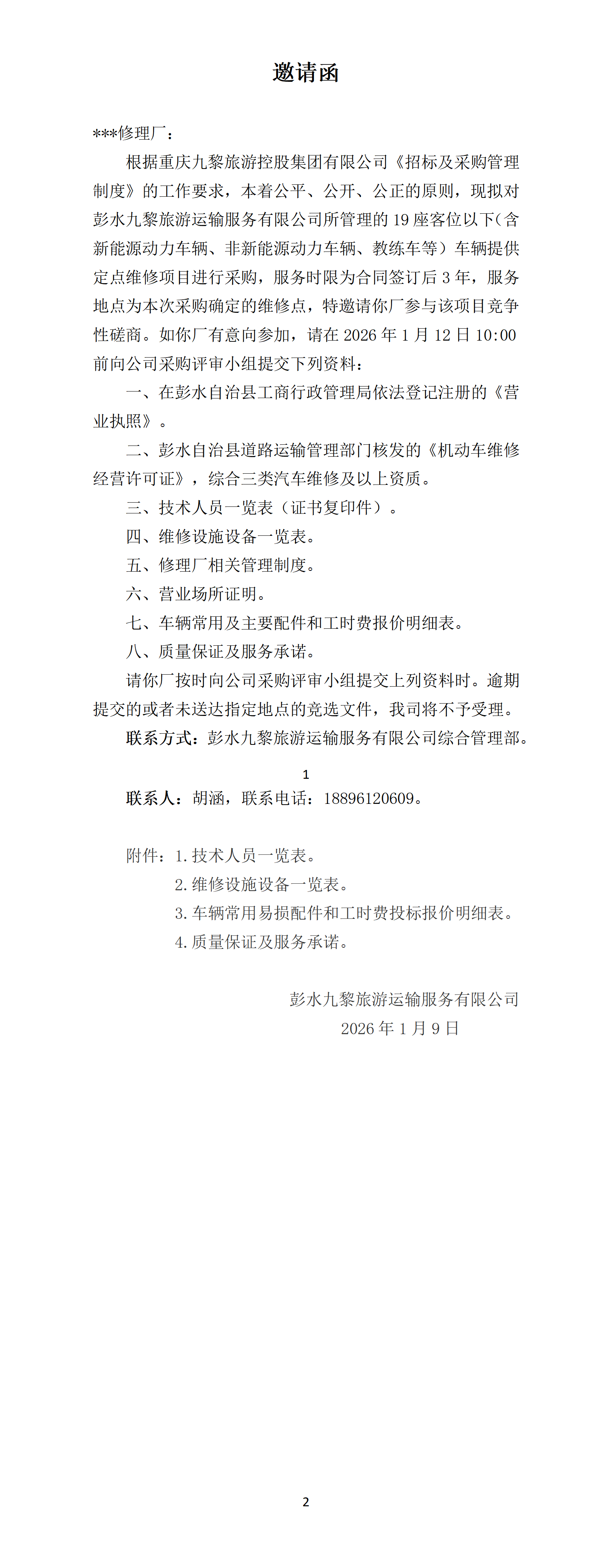 彭水九黎旅游運輸服務(wù)有限公司車輛定點維修采購項目邀請函
