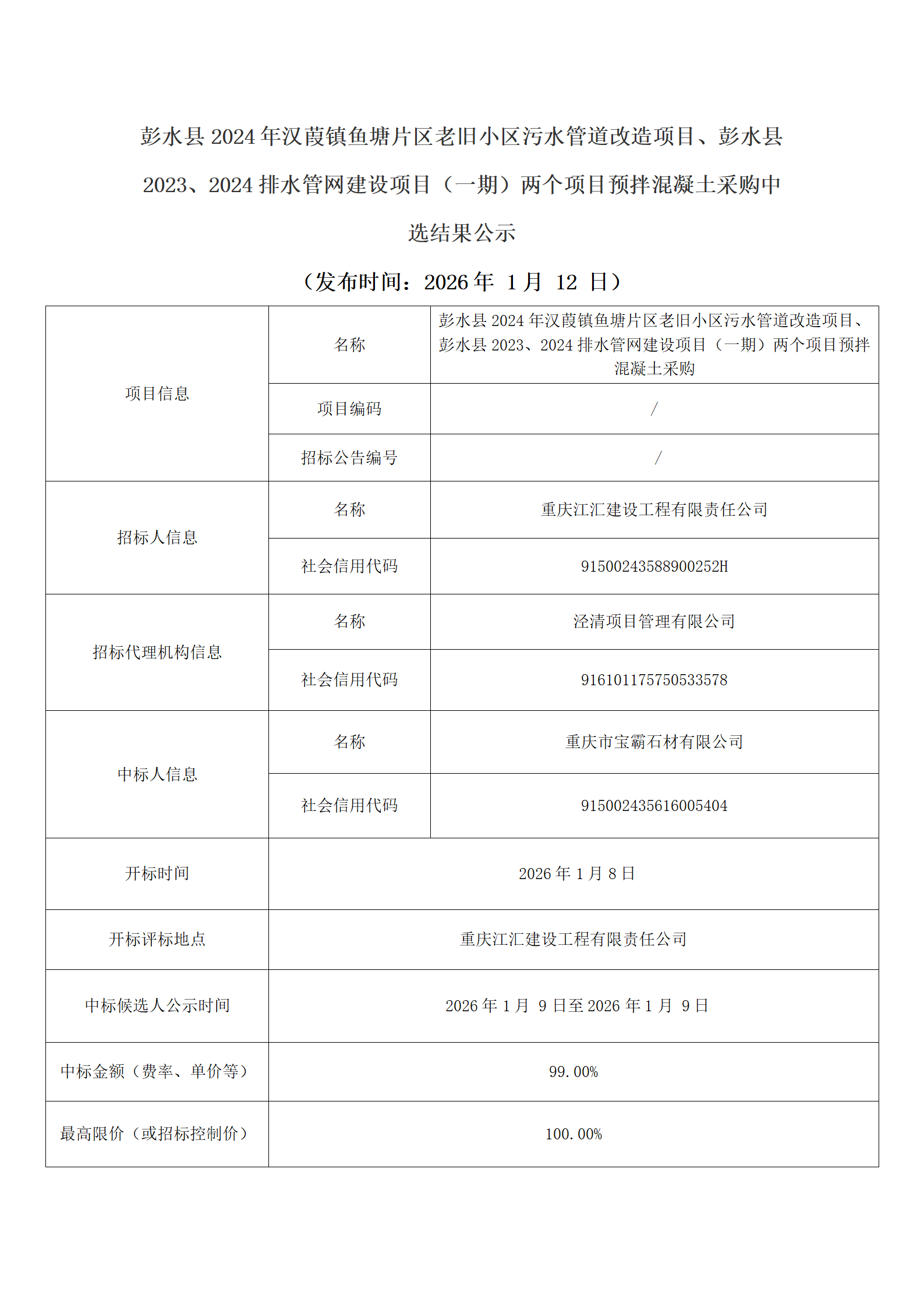 彭水縣2024年漢葭鎮(zhèn)魚(yú)塘片區(qū)老舊小區(qū)污水管道改造項(xiàng)目、彭水縣2023、2024排水管網(wǎng)建設(shè)項(xiàng)目(一期)兩個(gè)項(xiàng)目預(yù)拌混凝土采購(gòu)中選結(jié)果公示