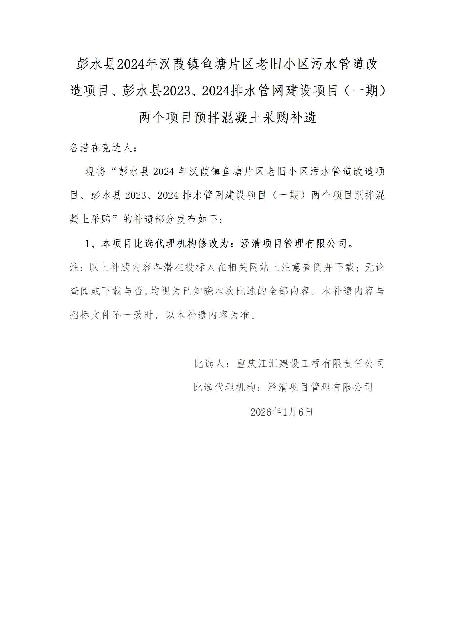 彭水縣2024年漢葭鎮(zhèn)魚塘片區(qū)老舊小區(qū)污水管道改造項目、彭水縣2023、2024排水管網(wǎng)建設(shè)項目(一期)兩個項目預(yù)拌混凝土采購比選公告